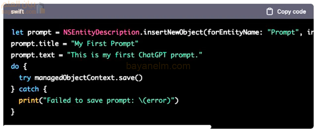 ثم أعطت مثالاً لكيفية حفظ مطالبة. يمكنك استخدام أجزاء التعليمات البرمجية هذه كنقطة بداية، ثم إضافة التعليمات البرمجية الخاصة بك في الأعلى. ولكن بمساعدة ChatGPT، لديك نقطة بداية جيدة: