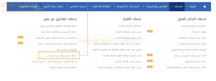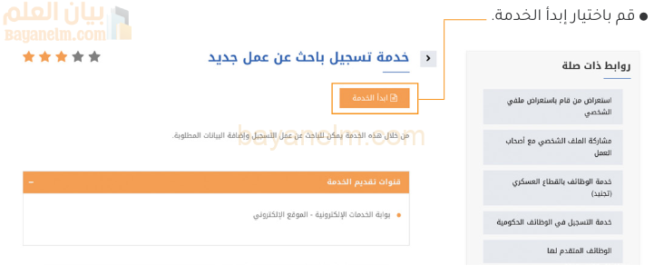 قـــم باختيـــار الخدمـــات، خدمـــات الباحثين عن عمل، خدمة تسجيل باحث عن عمل جديد، وستظهر لـك نافـذة وصـف الخدمة.