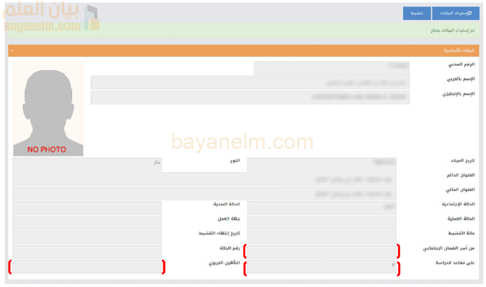 خانـة (مـن أسـر الضمـان الاجتماعـي) تتغيـر الحالـة بحسـب البيانـات المسـجلة فـي وزارة التنميـة االجتماعيـة ألصحـاب الضمـان الاجتماعـي عنـد اسـتجلاب البيانـات.