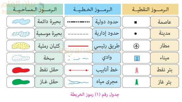 وهي مجموعة من الأشكال والخطوط والألوان، ترسم على الخريطة للتعبير عن الظواهر الجغرافية الموجودة في الطبيعة. ومهما اختلفت الرموز المستخدمة في الخرائط ، فيمكن تصنيفها إلى ثلاثة أنواع (الجدول رقم ١):