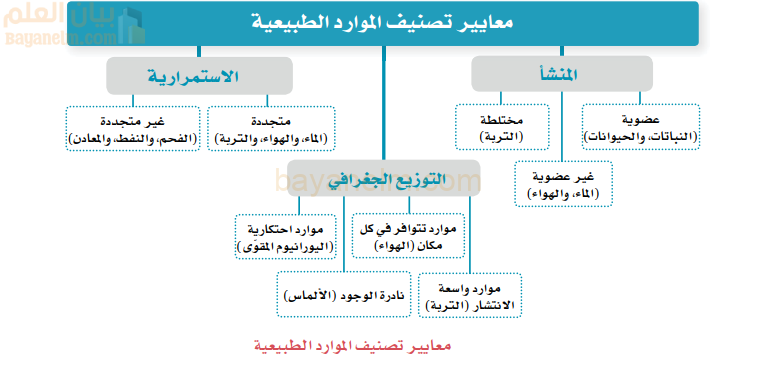 حيث يتزايد الاهتمام بالموارد الطبيعية خاصة في حال ندرتها مقابل زيادة الحاجة إليها، إضافة إلى أن مستوى الرفاهية الاقتصادية لأي دولة أصبح يقاس بحجم مواردها وتنوّعها وكيفية استغلالها. وبالإمكان تصنيف الموارد الطبيعية تبعًا لمعايير مختلفة تعتمد على الغرض من التصنيف، كما يوضِح الشكل (١) بعض هذه المعايير: