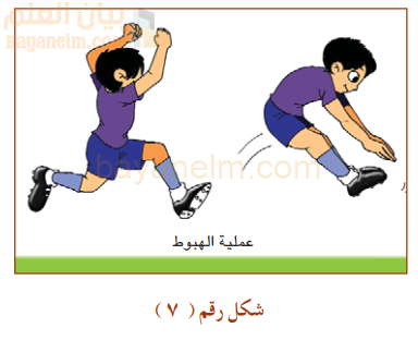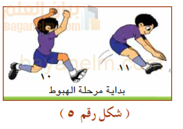 تبدأ مرحلة الهبوط حيث أميل بالجذع للأمام مع مرجحة ذراعي للأمام ولأسفل وللخلف، وعند ملامسة قدميّ لرمل الحفرة أثني ركبتي مع دفع الحوض للأمام . شكل رقم (٥).