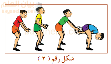 القطار ويبدأ بتمرير الكرة إلى زميلة في الخلف بنفس الطريقة، وهكذا إلى أن يعود كل طالب إلى مكانه الأصلي. تفوز المجموعة التي تنتهي أولاً. شكل رقم (٢).
