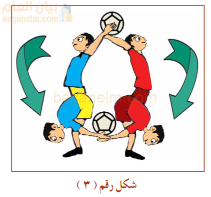 *من وضع الوقوف أرفع ذراعي لأعلى مع مسك كرة طبية. أنا وزميلي مواجهان بالظهر، أسلم الكرة الطبية من فوق الرأس لزميلي الذي يقوم بتسليمها لي من بين الرجلين. شكل رقم (٣).
