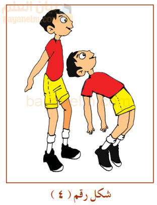 • من وضع الوقوف مع فتح الرجلين. الذراعان للخلف. ثني الركبتين مع تقوس الظهر للخلف ومحاولة لمس العقبين . شكل رقم (٤).