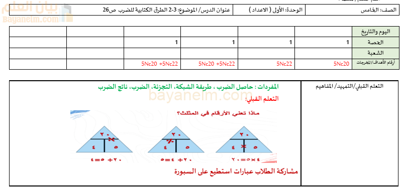 نقدم لكم تحضير درس الطرق الكتابية للضرب لمادة الرياضيات للصف الخامس الفصل الدراسي الاول المنهج العماني