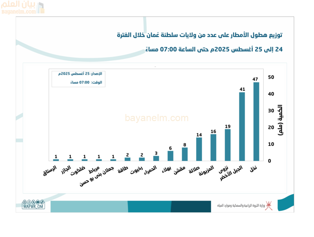 جاءت ولاية نخل في صدارة الولايات من حيث كمية الأمطار المسجلة، حيث بلغت 47 ملم، تلتها ولاية الجبل الأخضر بمعدل 41 ملم. ويُعزى ذلك إلى الطبيعة الجبلية والمناخية لهذه المناطق التي تسهم عادة في جذب السحب وتكثيف الأمطار.