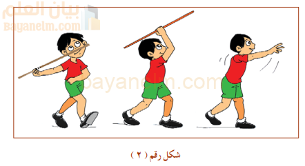 ٨ – من وضع الوقوف أحمل الرمح ، وأضع الرجل اليسرى للأمام مع سحب الرمح للخلف للوصول إلى وضع الاستعداد ثم أرمي الرمح لأبعد مسافة ممكنة .
