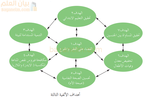 وتمثل الأهداف الإنمائية للألفية نسيجا متكاملا بحيث لايمكن تحقيق غاية بمعزل عن الأخرى ، كما يتضح ذلك من الشكل الآتي :