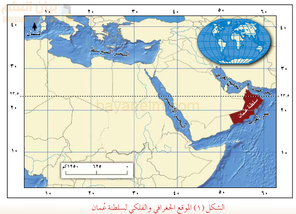 فلكيا فتقع في النصف الشمالي من الكرة الأرضية، حيث يمر مدار السرطان (٢٣,٥) على عدد من محافظات شمال السلطنة، ونظرا للامتداد الطولي الذي تتميز به سلطنة عُمان في ١٠ درجات عرضية تنوعت تضاريسها وبيئاتها الطبيعية .