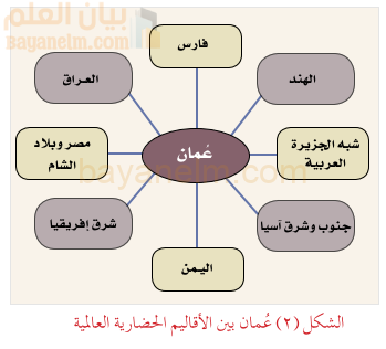 ١. سهولة التواصل مع الحضارات والأقاليم المجاورة، إذ أسهم موقع عُمان الجغرافي وانفتاحه على المحيط الهندي في تعزيز التواصل مع الأقاليم الحضارية المختلفة منذ القِدم (الشكل٢)، وما زال دور عُمان الحضاري في التواصل مع الدول الأخرى مستمرًّا حتى اليوم، حيث تقوم السلطنة بدور فعَّال في تعزيز التبادل الثقافي والحضاري بين الشعوب.