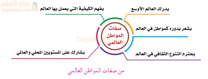 أكدت العديد من التشريعات والمواثيق الدَّوْلية على أهمية التزام المواطن العالمي بواجباته اتجاه الشعوب التي تعيش خارج وطنه، وامتلاكه للسلوكيات السليمة والواعية والمسؤولة للتغلب على كافة التحديات التي تواجه أجيال الحاضر والمستقبل، ويتصف المواطن العالمي بالعديد من الصفات يوضِّحها الشكل.