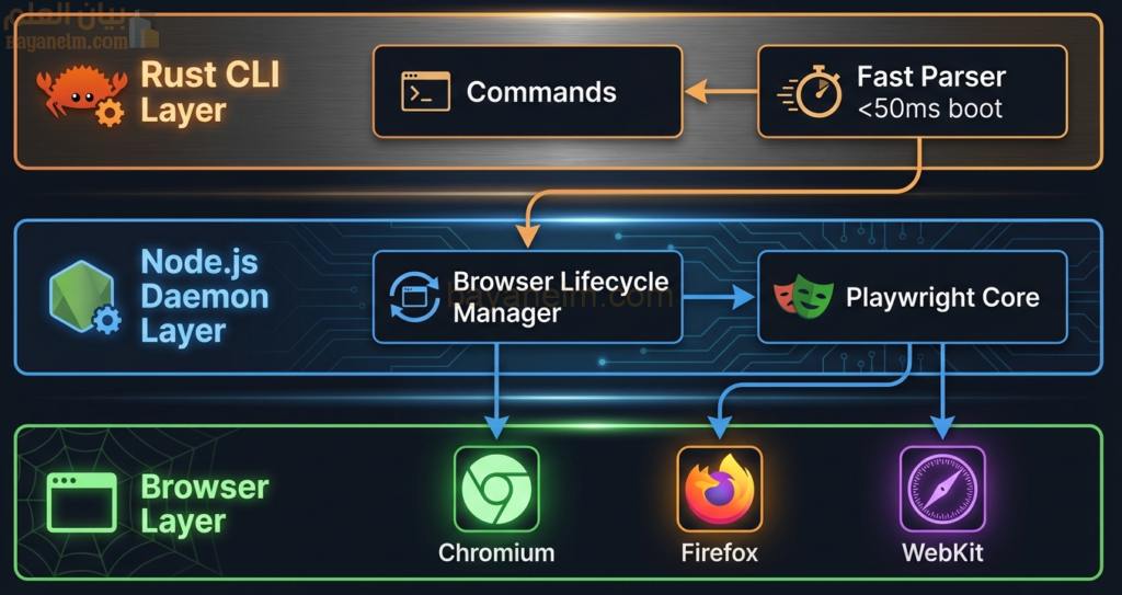 تعتمد agent-browser على نظام ثلاثي الطبقات: طبقة CLI بلغة Rust للأوامر السريعة (أقل من 50 مللي ثانية لبدء التشغيل)، طبقة ديمون Node.js لإدارة دورة حياة المتصفح باستخدام Playwright Core، وطبقة المتصفح التي تدعم Chromium، Firefox، وWebKit. الفكرة الرئيسية هي نظام اللقطات والمراجع (snapshot + refs)، الذي يقلل من الحاجة إلى محددات DOM التقليدية، مما يجعل التفاعل أكثر كفاءة للذكاء الاصطناعي.