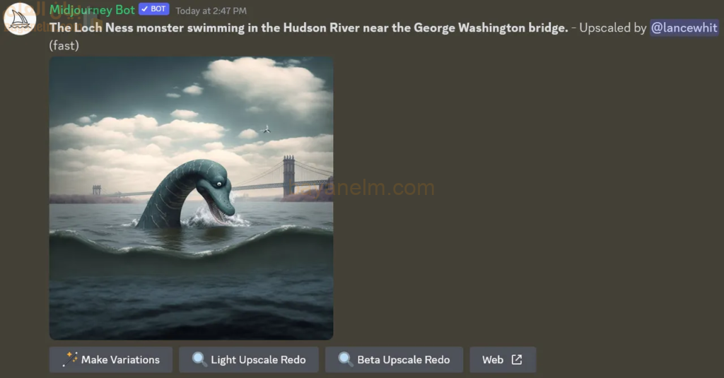 يمكنك أيضًا اللعب بصورة تمت ترقيتها. أسفل الصورة، انقر فوق الزر ” إنشاء اختلافات” لإنشاء مراجعات للصورة. انقر فوق الزر “إعادة الترقيات الخفيفة” لترقيات الصورة قليلاً باستخدام الإصدار الحالي من Midjourney. انقر فوق الزر ” إعادة الترقيات التجريبية” لترقيات الصورة إلى مستوى أعلى باستخدام أحدث إصدار تجريبي. انقر فوق الزر “الويب” لعرض الصورة بحجم أكبر في نافذة منفصلة.