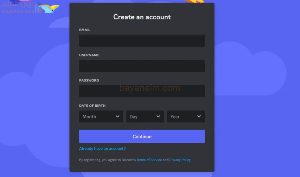 سيتم نقلك بعد ذلك إلى موقع Discord الإلكتروني، الذي يوفر الخادم الذي يتم إنشاء الاستجابات عليه. إذا لزم الأمر، انقر فوق الزر ” متابعة إلى Discord” . في نافذة تسجيل الدخول، انقر فوق رابط “التسجيل”. أدخل عنوان بريدك الإلكتروني، واكتب اسم مستخدم وكلمة مرور، وحدد تاريخ ميلادك. انقر فوق “متابعة”.
