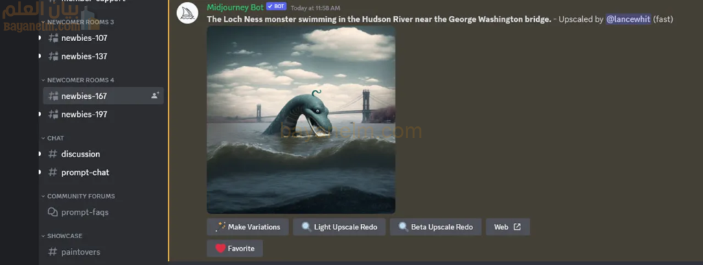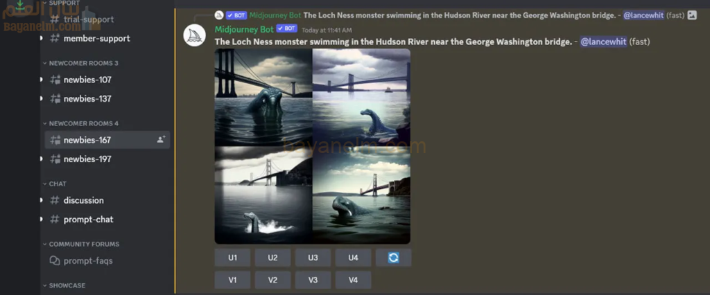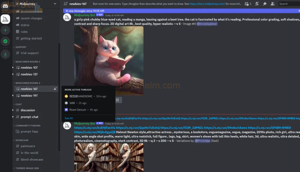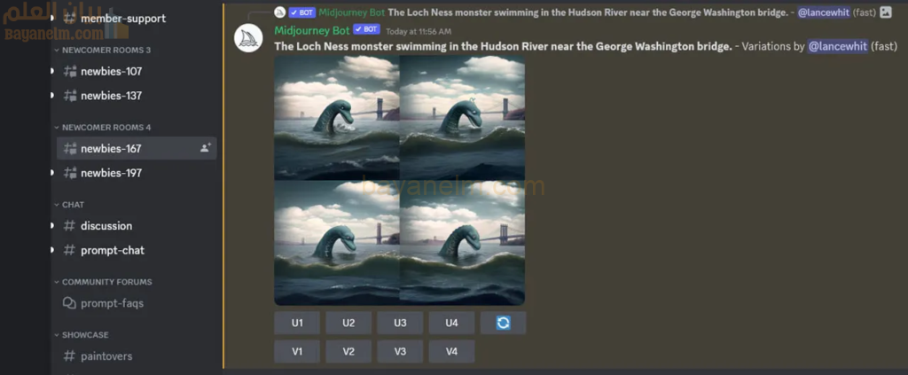 بعد انضمامك، سيعرض الشريط الجانبي الأيسر مجموعات المبتدئين ضمن غرف الوافدين الجدد. انقر فوق إحدى الغرف للوصول إليها. قم بالتمرير لأعلى ولأسفل الصفحة لرؤية الصور التي أنشأها روبوت Midjourney AI للمستخدمين الآخرين.