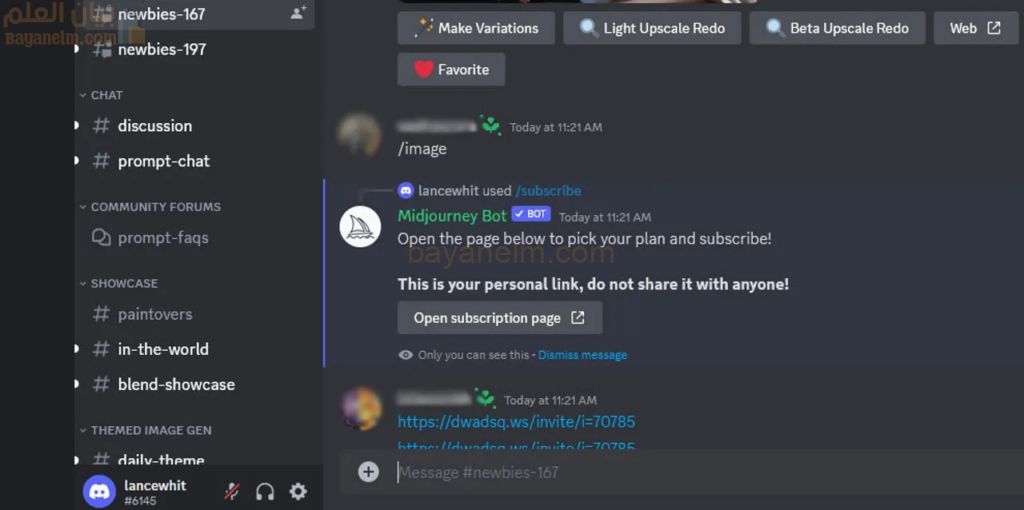 نظرًا لعدم توفر الإصدار التجريبي المجاني بعد الآن، سيتعين عليك الاشتراك في خطة مدفوعة قبل أن تتمكن من تجربة خدمة Midjourney. في حقل الرسالة أسفل الشاشة، اكتب /subscribe واضغط على Enter. انقر فوق الزر ” فتح صفحة الاشتراك” .