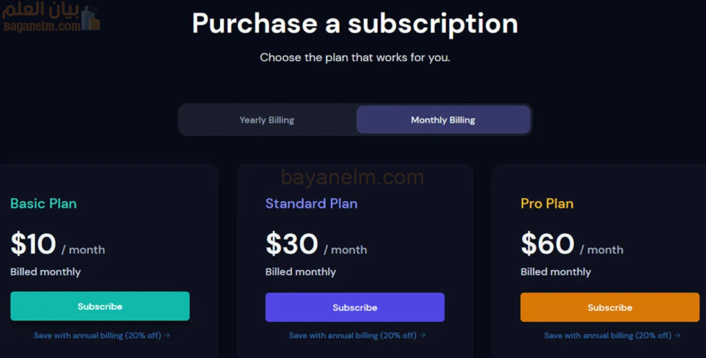 في صفحة الاشتراك، اختر إما الفوترة السنوية أو الفوترة الشهرية. انقر فوق زر الاشتراك للخطة التي تريدها ثم املأ نموذج الدفع. بعد إتمام الدفع، عد إلى صفحة Discord ومجموعة المبتدئين التي قمت بالوصول إليها.