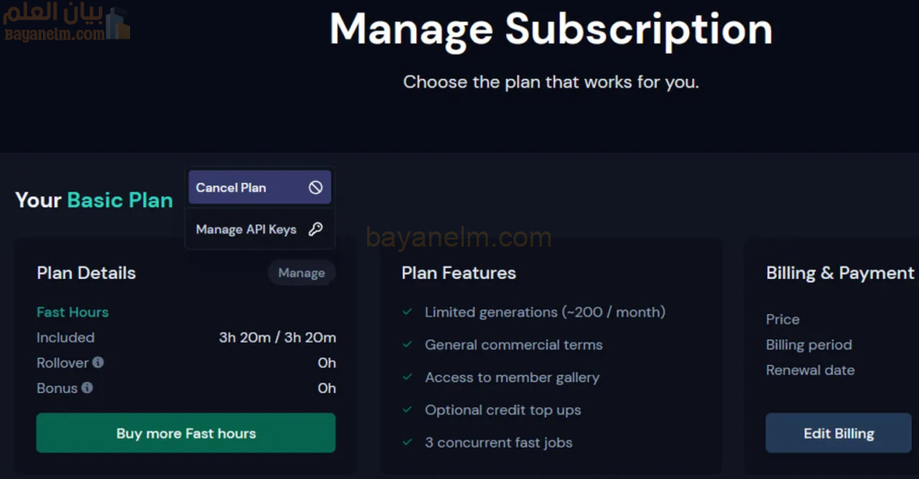 أخيرًا، إذا قررت عدم الاستمرار في استخدام Midjourney، فيمكنك إلغاء اشتراكك. سجّل الدخول إلى صفحة حساب Midjourney الخاص بك. انقر فوق رابط “إدارة” بجوار “تفاصيل الخطة” لخطتك، ثم حدد “إلغاء الخطة”. أكِّد الإلغاء.