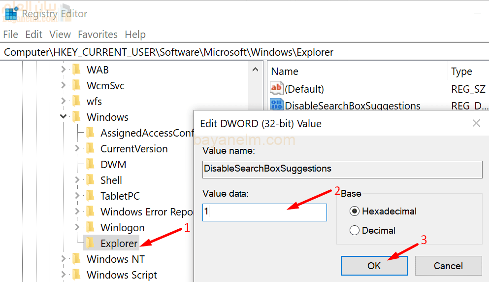 5- قم بتسمية القيمة الجديدة DisableSearchBoxSuggestions .