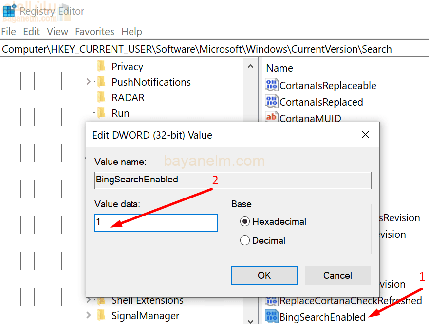 7- انقر نقرًا مزدوجًا فوق BingSearchEnabled وقم بتحرير قيمته من صفر إلى 1 .
