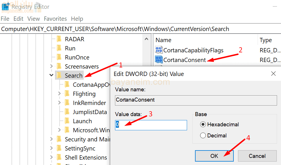 9- انقر نقرًا مزدوجًا فوق CortanaConsent وقم بتحرير بيانات القيمة من 1 إلى 0 (صفر).