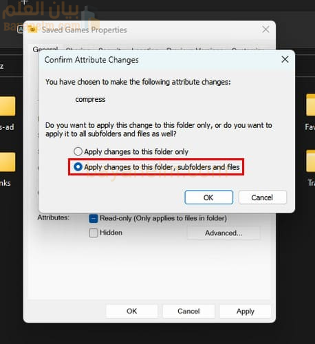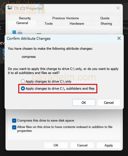 عندما تظهر نافذة “الخصائص”، حدد المربع بجوار ” ضغط هذا القرص لتوفير مساحة القرص” . انقر فوق الزر “تطبيق” ، وستظهر لك أيضًا نفس النافذة التي رأيتها إذا ضغطت مجلدًا حيث يمكنك اختيار ضغط جميع المجلدات والمجلدات الفرعية. ومن الآن فصاعدًا، سيتم ضغط أي ملفات تضيفها إلى القرص.
