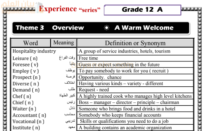 الملف هو مذكرة شاملة لمادة اللغة الإنجليزية للصف الثاني عشر (Grade 12 A) ضمن “سلسلة الخبرة” (Experience Series)، ويغطي الوحدة الثالثة (Theme 3) التي تدور حول السفر، السياحة، والضيافة.