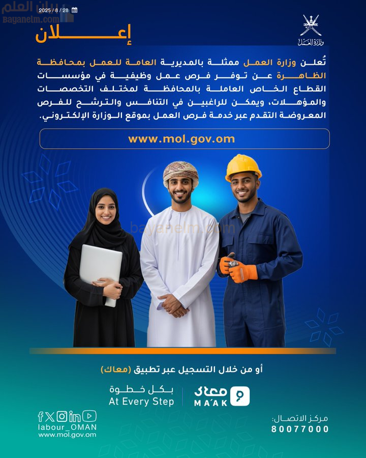 أعلنت وزارة العمل، ممثلة بالمديرية العامة للعمل في محافظة الظاهرة، عن توفر عدد من فرص العمل الوظيفية في مؤسسات القطاع الخاص العاملة بالمحافظة، وذلك في مختلف التخصصات والمؤهلات.