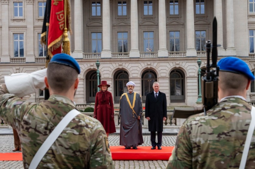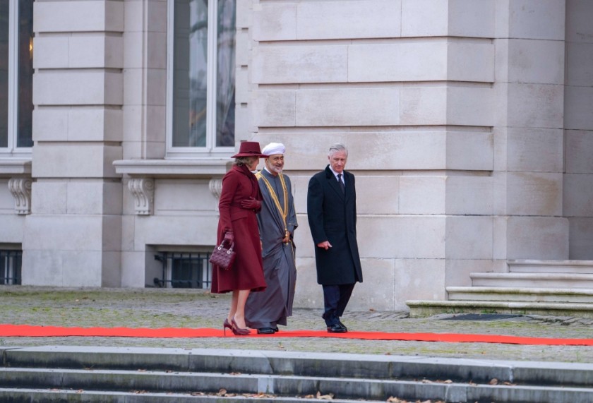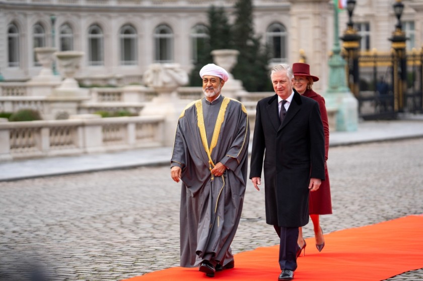 بعد ذلك اصطحب جلالة الملك فيليب ليوبولد جلالته إلى منصة الشرف، حيث عزف السلام الملكي العماني والنشيد الملكي البلجيكي.