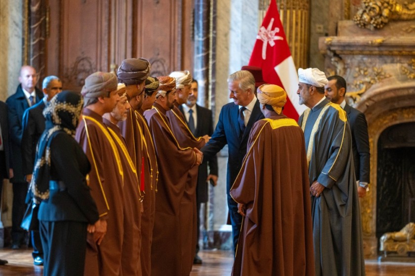 بعد ذلك توجه الزعيمان إلى القاعة الرئيسية حيث صافح جلالة السلطان جمعة من البلجيكيين الذين رحبوا به. بعد ذلك صافح الملك والملكة الوفد العماني الرسمي. وبعد التحية وقع جلالة السلطان في سجل الزوار.