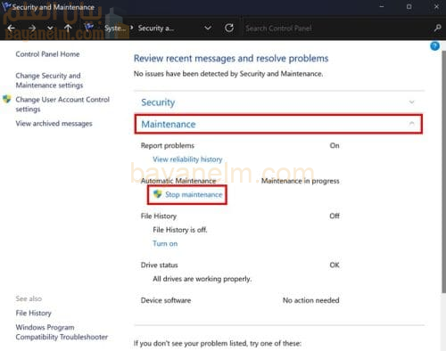 لقد لاحظت أن الصيانة التلقائية لنظام التشغيل Windows قد بدأت وتريد إيقافها. يمكنك القيام بذلك عن طريق فتح لوحة التحكم . ابحث في شريط البحث وانقر فوق خيار فتح . انتقل الآن إلى النظام والأمان> الأمان والصيانة> الصيانة . انقر فوق القائمة المنسدلة للصيانة لمزيد من الخيارات. ضمن الصيانة التلقائية ، يجب أن ترى خيار إيقاف الصيانة إذا كانت الصيانة جارية.